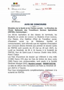 Aux élèves en classe de Terminale, aux bacheliers, aux étudiants en licence ou master ou titulaires d’une licence ou d’un master, aux diplômés en travail social, de nationalité sénégalaise, les concours directs d’entrée aux premier et second cycles de l’ENTSS sessions 2024 sont ouverts.